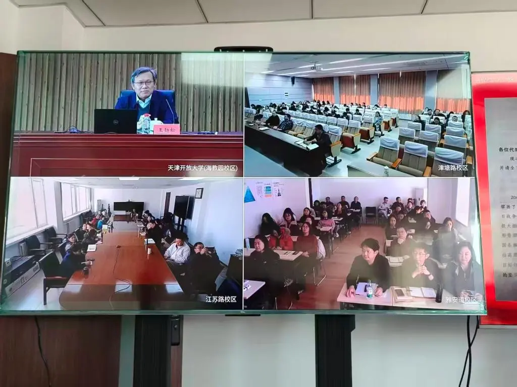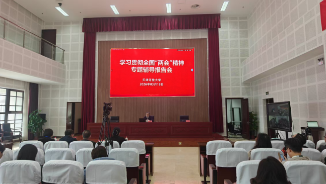 为深入学习贯彻习近平总书记重要讲话精神和全国两会精神,切实把全校教职工的思想和行动统一到党中央决策部署上来,近日,我校举行传达学习贯彻全国两会精神专题报告会。本次报告会采用线上线下相结合的方式,主会场设于海河园校区3楼大礼堂,津塘路校区、江苏路校区、雅安道校区分别设分会场。报告会由校党委书记、校长杜长有主持,全体教职工在所在校区参加。